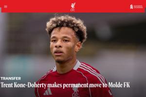 官方:利物浦19岁边锋多尔蒂加盟莫尔德,转会费75万欧含回购条款