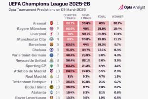 OPTA预测欧冠冠军:阿森纳断层第1,仁军城萨2-5位,皇马1.9%第11