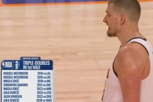此役上半场,约基奇拿到15分11篮板9助攻的数据,差1次助攻错失半场三双。